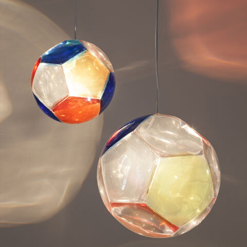 Medium "Dodecahedron" chandelier and optical instrument with three yellow lenses, three blue lenses, three red lenses, and three clear lenses, in poured polyurethane resin. Edition 1 of 9 with 2 APs. 14" D / 35.56cm D.