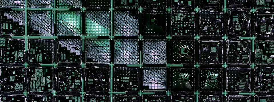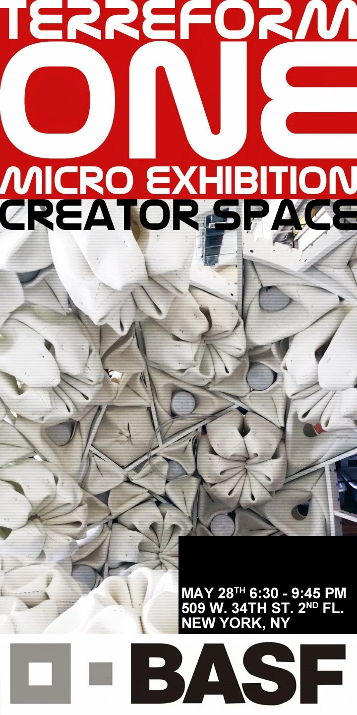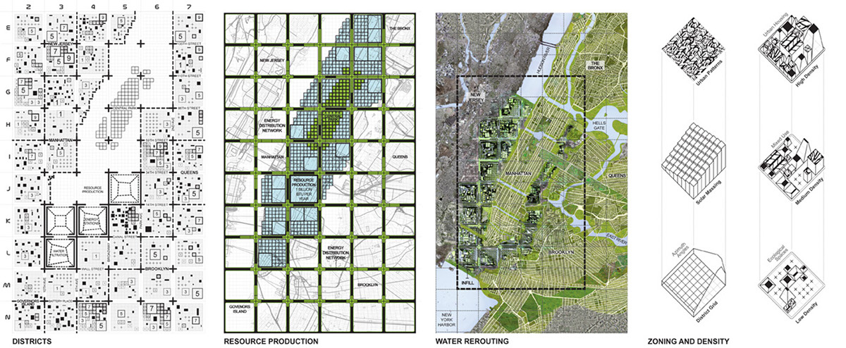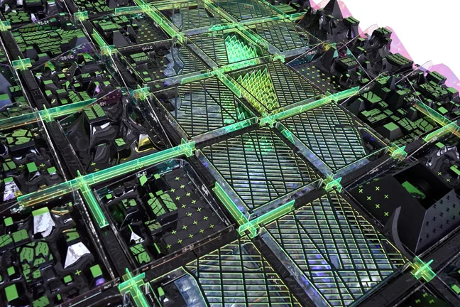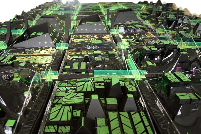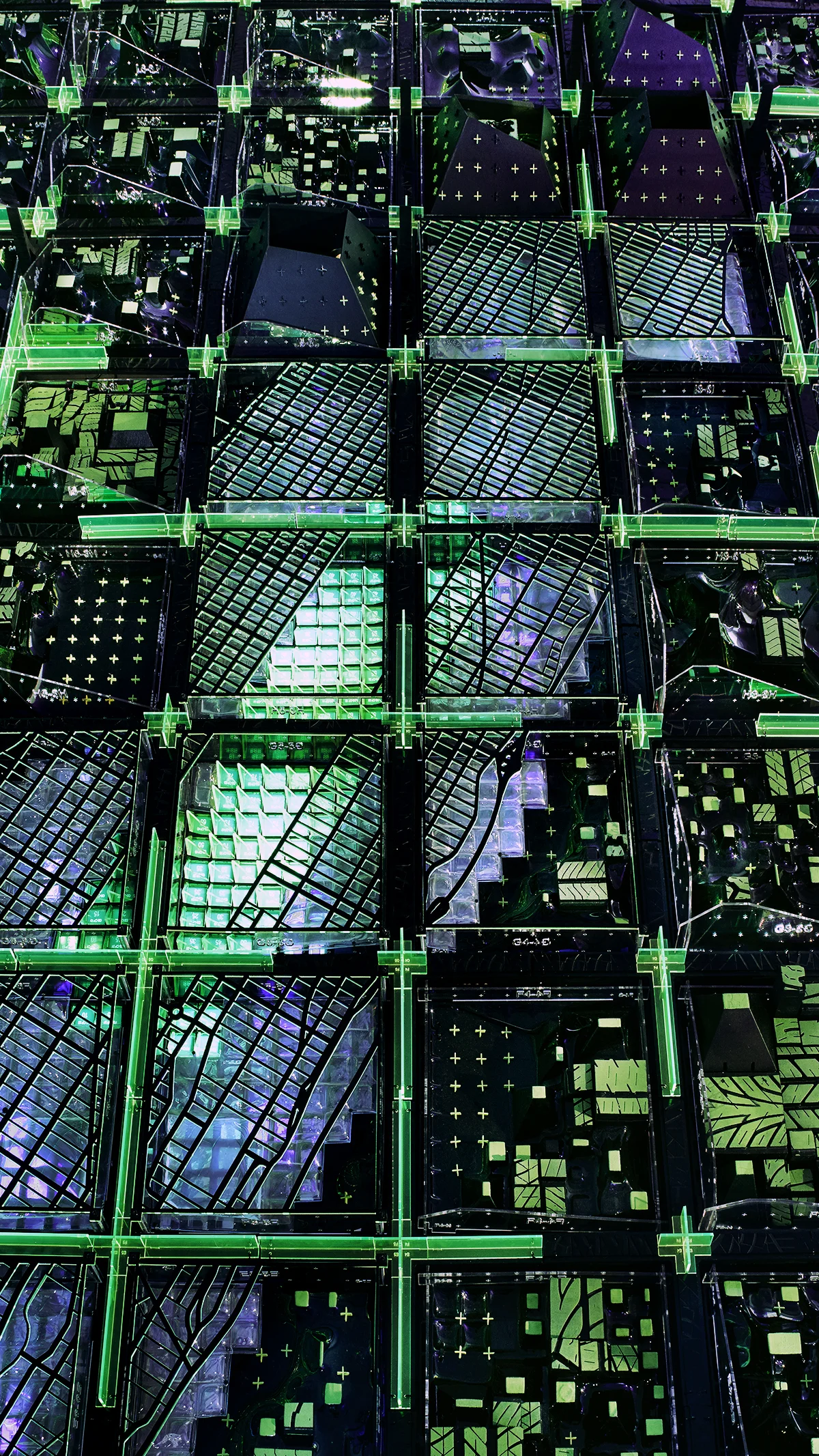 Upcycled car tire patterns represent the embedded post carbon materials that are the building blocks of the new city.